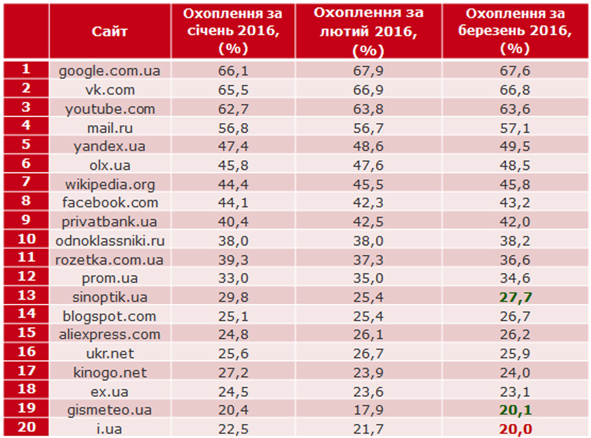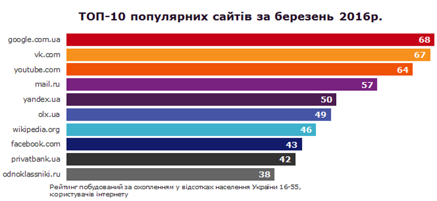 Самыми популярными сайтами среди украинских интернет-пользователей в марте оставались Google.com.ua, Vk.com, Youtube.com. Об этом сообщает TradeMaster.UA со ссылкой на данные исследования CMeter, размещенные на сайте компании TNS.