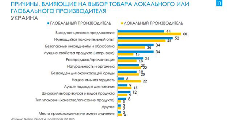 Главным фактором при выборе товаров локального производства для 60% украинских потребителей стало выгодное ценовое предложение. Из тех, кто выбирает товары международных брендов, 52% потребителей заявили, что на решение купить этот продукт повлиял имеющийся положительный опыт его использования.