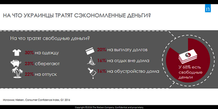 Каждый третий украинец (32%) в онлайн опросе заявляет, что у него не остается свободных денег после покупки товаров первой необходимости (+5 п.п. по сравнению с 4 кв. 2015). Сэкономленные деньги украинцы тратят на одежду (30%) и выплату долгов (20%). Количество тех, кто готов откладывать сбережения, снизилось (-4 п.п. по сравнению с прошлым кварталом).