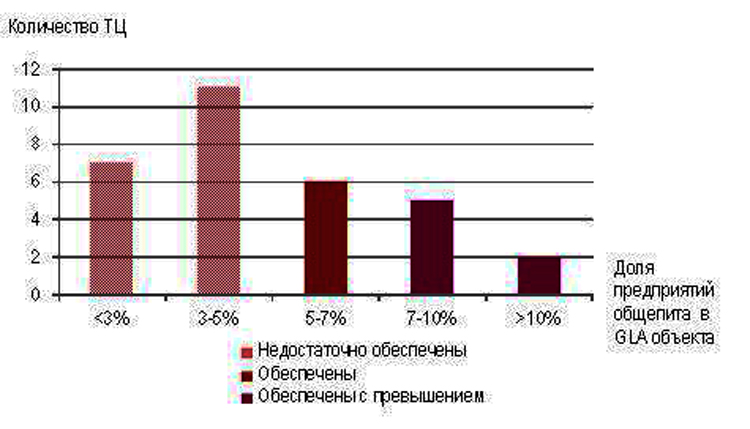Распределение ТЦ Киева по обеспеченности заведениями общественного питания