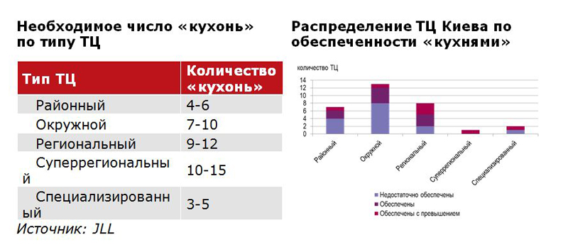 По словам Марьяны Супчан, аналитика компании JLL (Украина), «в международной практике чаще всего используют два типа показателей обеспеченности торгового комплекса объектами общественного питания – в зависимости от количества “кухонь” (заведений) в торговых центрах разного масштаба и исходя из доли от арендопригодной площади, занимаемой заведениями общепита».