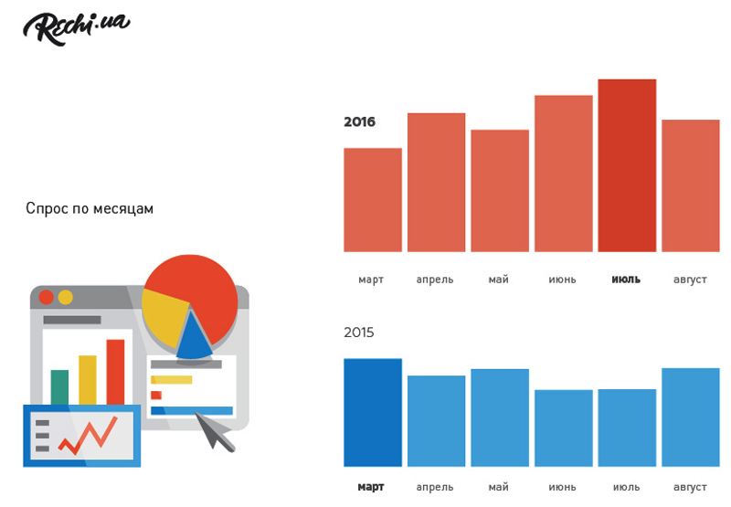 В 2015 самым насыщенным был первый месяц сезона - март. А вот в 2016 году больше всего обуви покупали ближе к концу сезона, в июле.