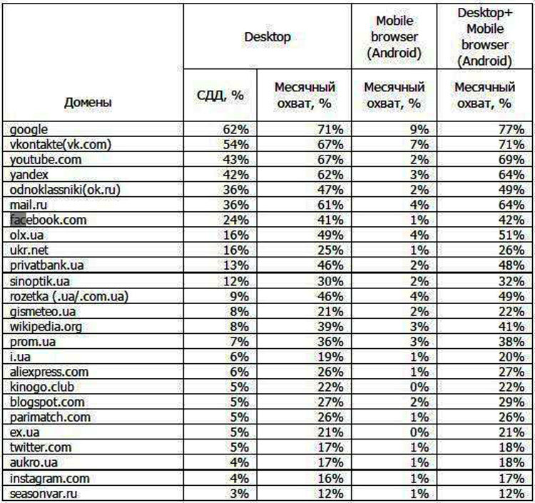 В первой двадцатке самых популярных сайтов – по-прежнему находятся пять интернет-магазинов. Главной сенсацией стал подъем площадки Prom.ua на 2 позиции верх (15-я строчка в рейтинге). В остальном позиции интернет-ритейлеров остались неизменными: OLX.UA (8-е место), Rozetka (12-я позиция), Aliexpress.com (17-е место в рейтинге), Aukro.UA (23-е положение).