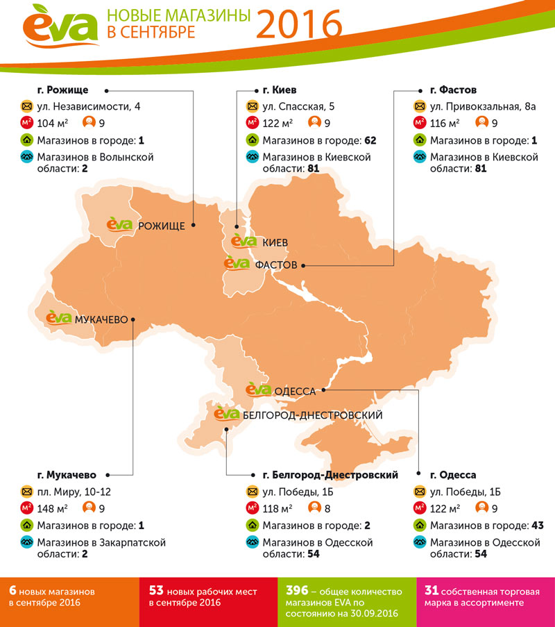 В сентябре 2016 года Линия магазинов EVA открыла 6 магазинов. Всего в Украине действуют 396 торговых точек. Линия магазинов EVA представлена в 21 области Украины: Днепропетровской, Харьковской, Киевской, Кировоградской, Николаевской, Одесской, Херсонской, Черкасской, Полтавской, Сумской, Запорожской, Донецкой, Черниговской, Житомирской, Львовской, Луганской, Хмельницкой, Тернопольской, Волынской, Ивано-Франковской и Закарпатской.