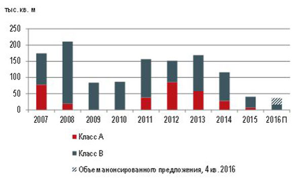 При этом в 4-м квартале объем ввода может превзойти суммарный результат первых трех кварталов 2016 года и превысить 20 тыс. кв. м. Таким образом, годовой показатель будет лишь на 10% ниже, чем в 2015 году, и составит 36,5 тыс. кв. м. На последний квартал года заявлен ввод двух объектов класса В – БЦ Protasiv Business Park, фаза 2 (14,0 тыс. кв. м) и БЦ на ул. Лейпцигская, 15, фаза 3 (6,4 тыс. кв. м).