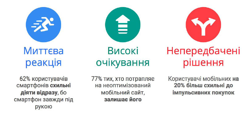 Смартфоны — это не просто еще один медиа-ресурс. Это не просто еще один экран. Смартфоны меняют бизнес-модель с одной стороны, и поведение пользователей с другой. Более 60% пользователей смартфонов готовы мгновенно действовать, потому что им не нужно включать компьютер, загружать браузер, искать сайт — смартфон всегда работает и он под рукой. При этом почти 80% людей готовы уйти с сайта, если он не оптимизирован под мобильные устройства.