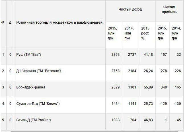 Замыкает тройку лидеров сеть "Брокард", которая специализируется на продаже косметики и парфюмерии высокого ценового сегмента. Доход за прошлый год вырос в полтора раза — до 2 млрд грн. Чистая прибыль сети — 348 млн грн.