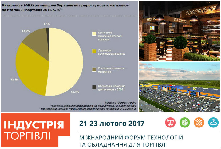 Согласно последнему отчету GT Partners Ukraine «ТОП 120 торговых операторов FMCG по количеству магазинов», за 9 месяцев 2016 года сетевые продовольственные операторы Украины открыли 324 магазина, из них 245 — абсолютно новые объекты, а остальные сменили вывеску в результате ребрендинга или сделки по поглощению. Из более 120 крупнейших ритейлеров food-сектора, действующих сегодня в нашей стране, за три квартала 2016 года удалось нарастить количество магазинов 43 компаниям (на 7 больше, чем за аналогичный период 2015 г.), 18 операторам пришлось сократить количество торговых точек, но у преимущественной части (52%) количество магазинов осталось неизменным. В целом, показатели по открытию новых сетевых FMCG-объектов, продемонстрированные за 9 месяцев текущего года, — отмечают в GT Partners Ukraine, находятся на самом высоком уровне за последние 6 лет.