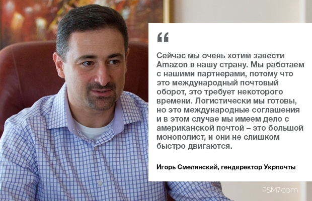 «Сейчас мы очень хотим завести Amazon в нашу страну. Сейчас мы работаем с нашими партнерами, потому что это международный почтовый оборот, это требует некоторого времени. Логистически мы готовы, но это международные соглашения, и в этом случае мы имеем дело с американской почтой — это большой монополист, и они не слишком быстро двигаются. Остальное — это сотрудничество с нашими таможенными органами, таможня должна увеличить штат, чтобы пропускать эти товары», — сказал Смелянский.