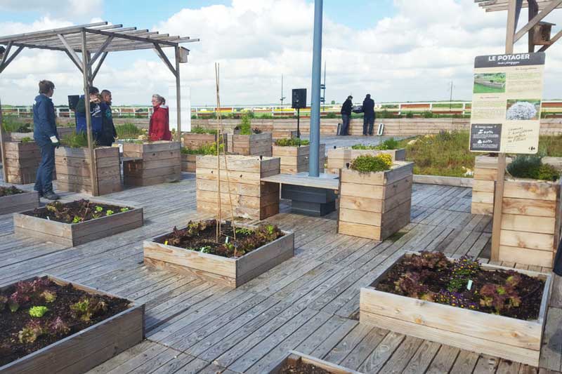 Французский ритейлер Carrefour создал фруктовый сад на поверхности крыши гипермаркета в Villiers-en-Bière. На площади 1200 м2 высажены декоративные и ароматические фруктовые деревья, плодовые и овощные растения, которые выращиваются с использованием методов агроэкологии.