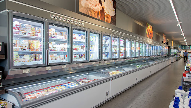 После охлаждения идет большой ассортимент замороженных продуктов. В отличие от предыдущих концепций здесь установлены комбинированные шкафы.