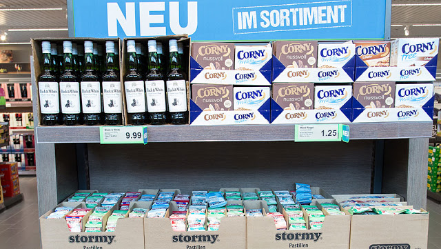 Также является новым для Aldi более широкое использование торцов, точнее их более новаторское оформление. Дисплеи фирменного производства на разные темы рекламируют самые разнообразные вещи.