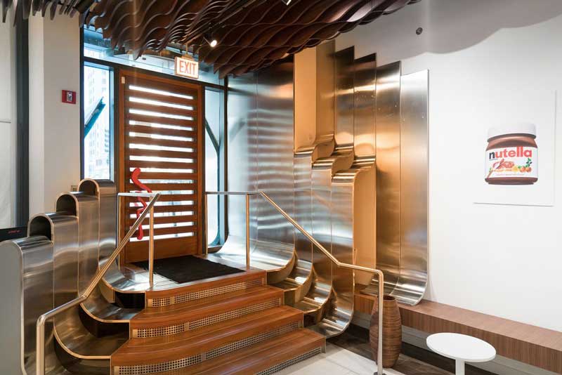 Ресторан расположится на двух этажах. Вход в кафе заставляет посетителей верить, что они входят в баночку Nutella, а интерьер выполнен в мягком кремово-шоколадном цвете с каплевидными украшениями и светильниками в форме цветков фундука.