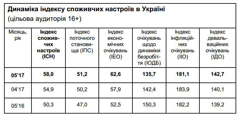 В мае 2017 года потребительские настроения украинцев несколько улучшились: индекс потребительских настроений (ИПН) составил 58, что на 3,2 п. больше апрельского показателя. Об этом редакции TradeMaster.UA сообщили в пресс-службе компании GfK Ukraine.
