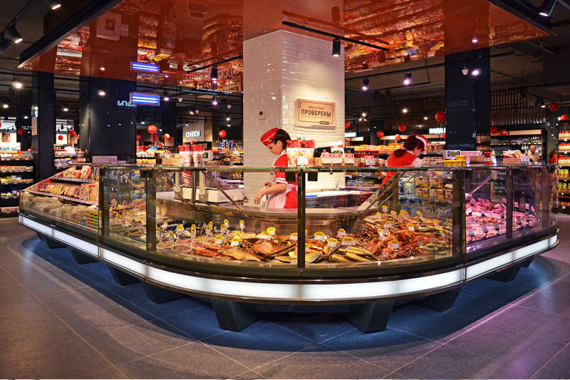 В центре – остров холодильных витрин премиум класса с панорамными подъёмными стеклами, и модулями для продажи в режиме самообслуживания, которые предоставляют покупателю полный обзор выкладки продуктов с любой точки торгового зала.