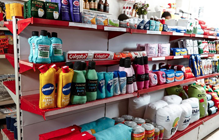 Девушка наполняет их полки точными копиями всех продуктов, которые обычно продаются в таких лавках, только сделанными из шерсти и фетра. Художница уже сделала три таких проекта в Лондоне — продуктовая лавка, секс-шоп и оружейный магазин.