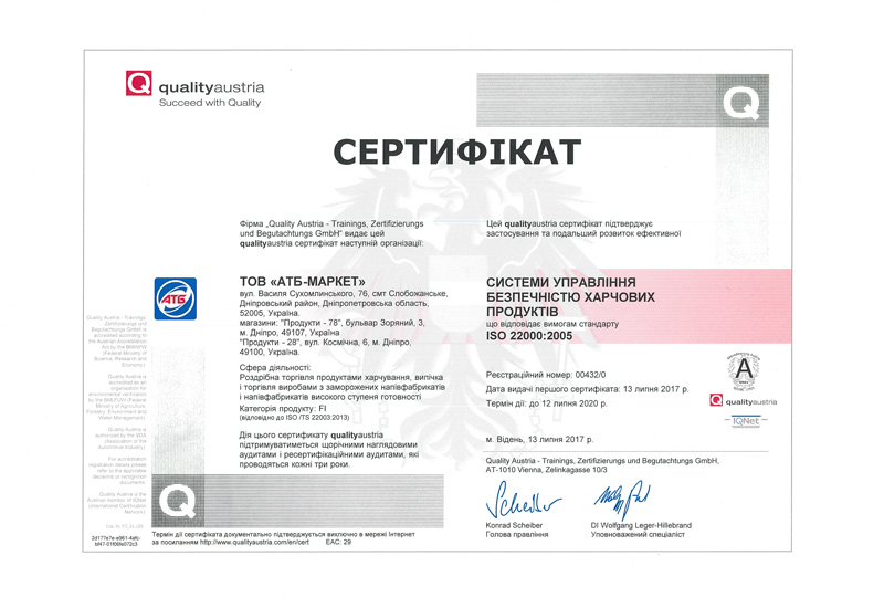 Австрийской кампанией «Quality Austria» проведен аудит и сертифицировано на соответствие требованиям международного стандарта ISO 22000:2005 первые два магазина торговой сети «АТБ-маркет». В основе стандарта ISO 22000:2005 лежат принципы НАССР.