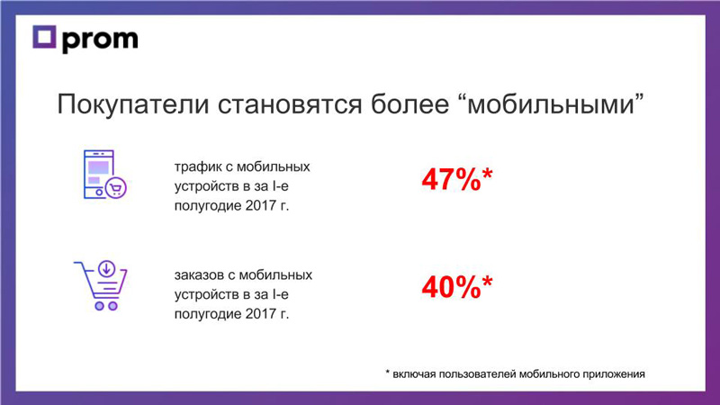 В I полугодии 2017 года около половины покупателей крупнейшего маркетплейса Украины Prom.ua использовали для онлайн-шопинга мобильные телефоны. Об этом редакции TradeMaster.UA сообщили в пресс-службе компании EVO.