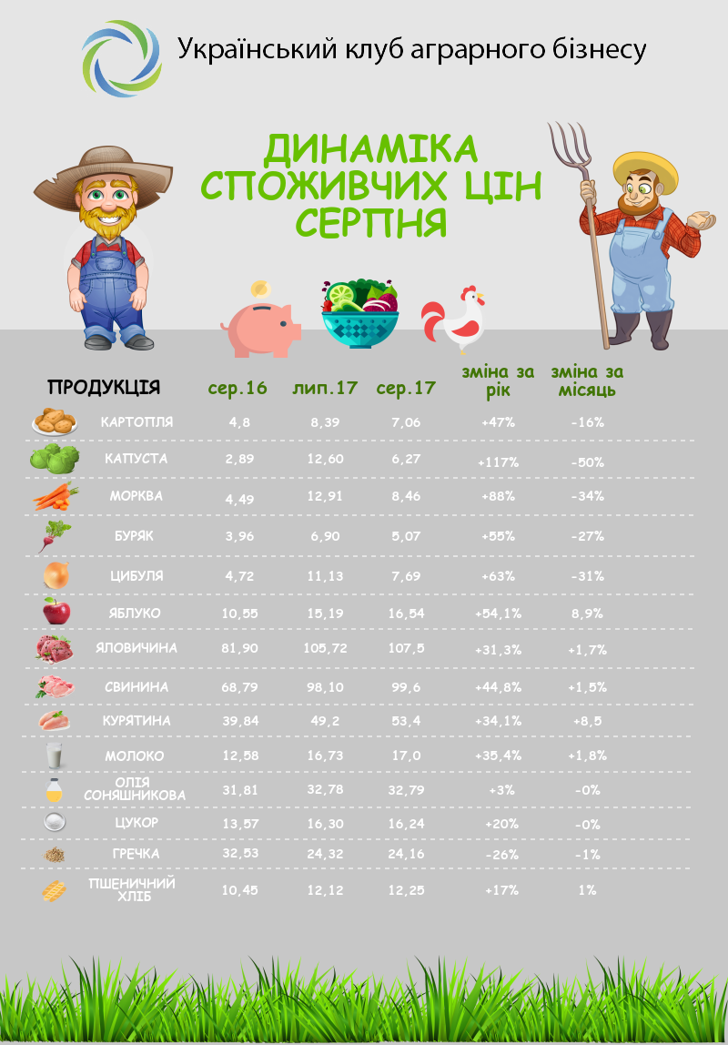 "В сентябре стоит ожидать продолжения снижения цен на овощи, однако темп будет более сдержанным, чем это было в августе. Цены на бакалейную продукцию, а именно сахар и гречку, в сентябре также начнут снижаться под влиянием сбора урожая и начала сезона сахароварения. Цена на масло и хлеб в сентябре будет колебаться в пределах 1-2%", — комментирует Евгений Дворник, эксперт аграрных рынков УКАБ.