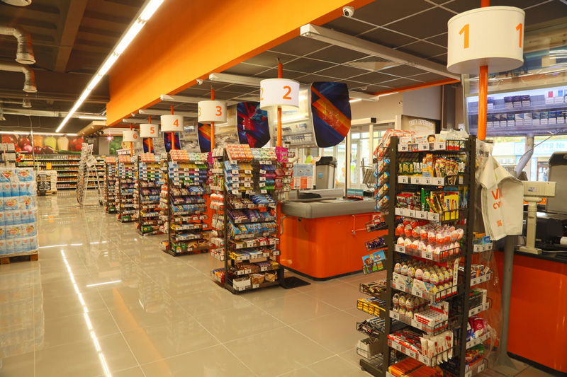 Торговая площадь магазина составляет 870 м², общее количество касс – 6, а на полках супермаркета представлено более 10 000 товаров.
