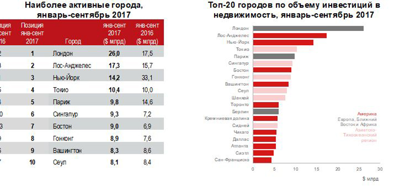 По итогам трех кварталов 2017 года в рейтинге городов по объему инвестиционных сделок на рынке недвижимости 1-е место занял Лондон, опередив Лос-Анджелес (2) и прежнего фаворита – Нью-Йорк (3). Благодаря высокой активности инвесторов, британская столица увеличила отрыв от 2-й строчки списка – 26 млрд против 17,3 млрд долл. Показатель Нью-Йорка по итогам трех кварталов составил всего 14,2 млрд долл. по сравнению с 33,1 млрд долл. в аналогичном периоде 2016 года. Вопреки общей неопределенности, связанной с процессом выхода Великобритании из Евросоюза, инвесторы продолжают фокусироваться на рынке недвижимости Лондона, и вероятность потери городом своей лидирующей позиции в нынешнем году низка.
