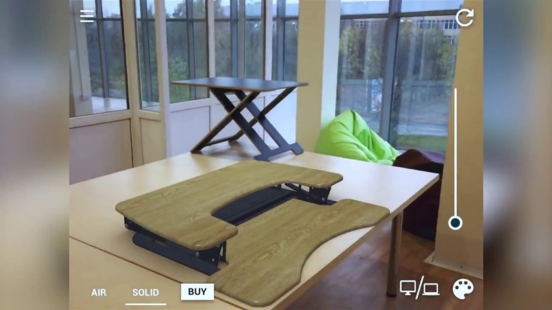 Приложение позволяет расположить виртуальную версию реального офисного стола на любую поверхность, позволяя клиенту оценить его реальные размеры, рассмотреть всевозможные опции и выбрать финальный вариант. Там же – в приложении – можно сделать заказ.