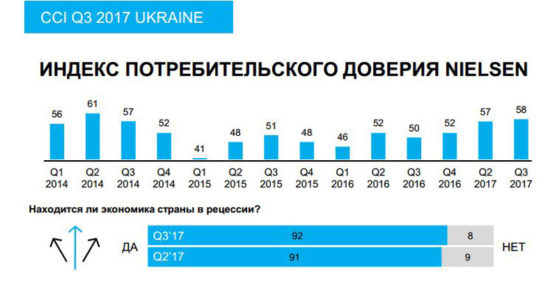 После резкого падения в ІІІ квартале 2015 года индекс потребительского доверия постепенно растет и вернулся на уровень показателей начала 2014 года (58). Это показали результаты исследования The Nielsen Global Consumer Confidence and Spending Intentions Survey в ІІІ квартале 2017 года, сообщили редакции TradeMaster.UA в пресс-службе компании.