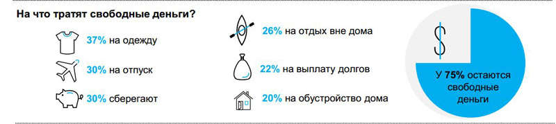 Те, у кого они остаются, тратят свободные деньги на новую одежду (37%), на отпуск (30%) и делают сбережения (30%).