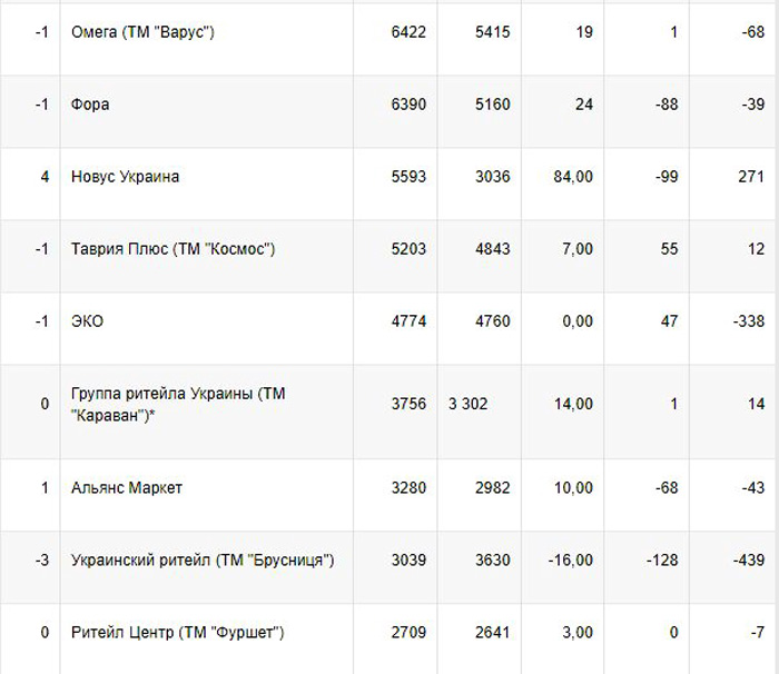 На первом месте по количеству новых магазинов оказалась сеть дискаунтеров "АТБ", которая в первом полугодии открыла 47 новых торговых точек и увеличила свою сеть до 882. На втором месте активно развивающийся ритейлер из Кривого Рога "Делви" — 19, до 128 магазинов. Третье место у компании Fozzy Group ("Сільпо", "Фора", Fozzy C&C и пр.), которая обзавелась 18 новыми объектами и управляет сетью из 528 магазинов. Всего в Украине насчитывается свыше 4300 сетевых продовольственных магазинов.
