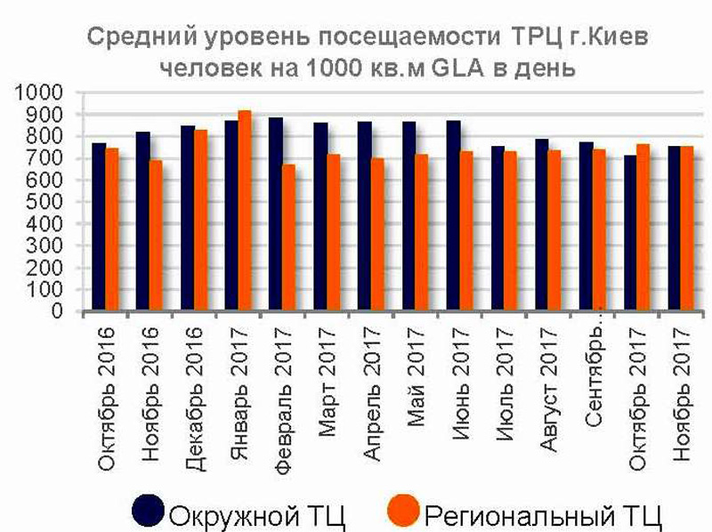 В результате средний по рынку показатель посещаемости в ноябре текущего года составил 754 человек на 1000 м2 GLA.