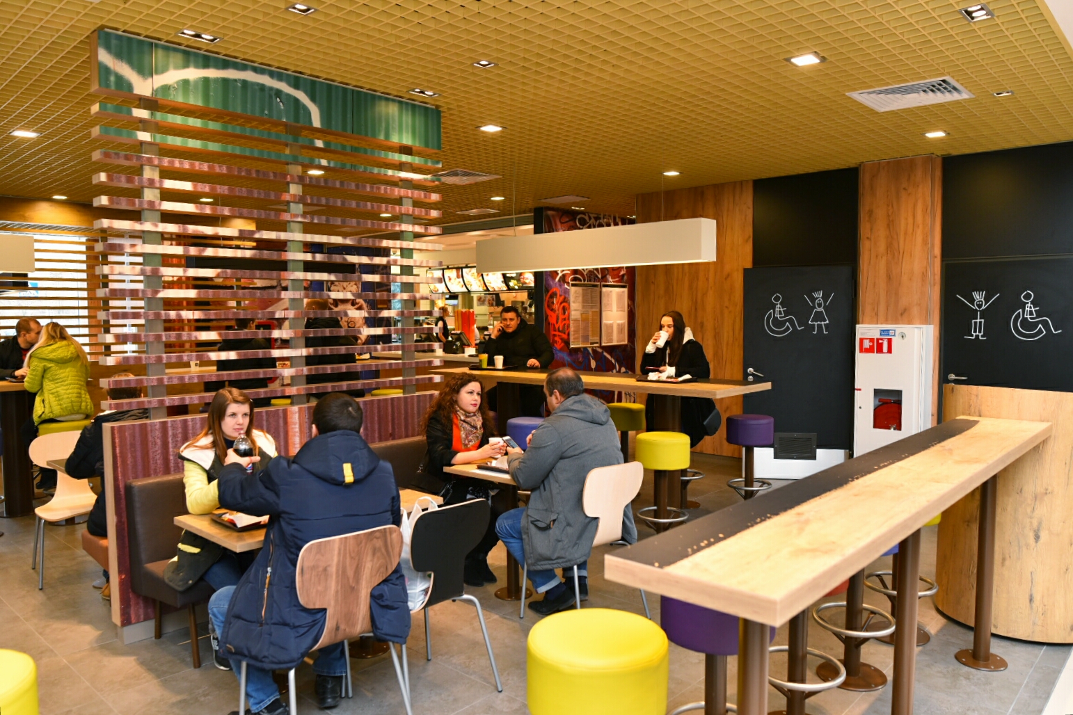 Оформление ресторана выполнено в специально разработанном для ресторанов сети МакДональдз® стиле Lim Extrim, который характеризуется современными яркими и насыщенными принтами на стенах.
