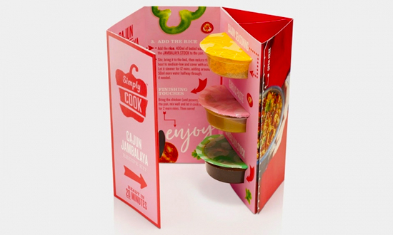 Упаковка примечательна интересной конструкцией. Она открывается как кулинарная книга. Внутри - подробный рецепт с картинками и 3 контейнера с соусами/заправками. Яркий дизайн привлекает внимание. Простота исполнения намекает на отсутствие сложностей с приготовлением блюда. Об этом говорит и название Simply Cook (просто готовь).