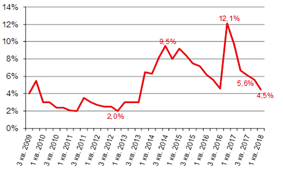 За 1-й квартал 2018 года доля свободных площадей на рынке качественных торговых центров Киева сократилась до 4,5%, что является наименьшим значением с конца 2013 года. Показатель непрерывно снижается в течение пяти кварталов, и его динамика не изменилась даже с учетом ввода 34 тыс. кв. м[1] в начале этого года.