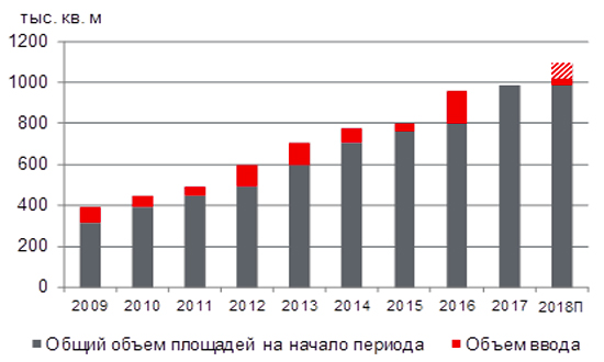 До конца 2018 года заявлен ввод еще 77 тыс. кв. м в двух торговых центрах, а именно: ТЦ «Смарт Плаза Политех» (15 тыс. кв. м), открытый в начале 2-го квартала, и ТРЦ River Mall (62 тыс. кв. м). Несмотря на запуск новых объектов, в 2018 году ожидается незначительное уменьшение вакантности вследствие недостатка торговых площадей на фоне высокого спроса. Так, в открытых в 1-м квартале торговых центрах практически отсутствуют свободные площади, хотя ряд магазинов пока не работают и завершают отделку.