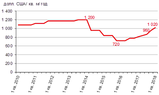 В качественных торговых центрах Киева в 1-м квартале 2018 года максимальные арендные ставки увеличились на 6% и превысили 1 тыс. долл. за кв. м в год (85 долл. за кв. м в мес.). Таким образом, показатель приблизился к докризисному уровню 2010-2013 годов, когда ставки достигали 1,1-1,2 тыс. долл. за кв. м в год. (90-100 долл. за кв. м в мес.).