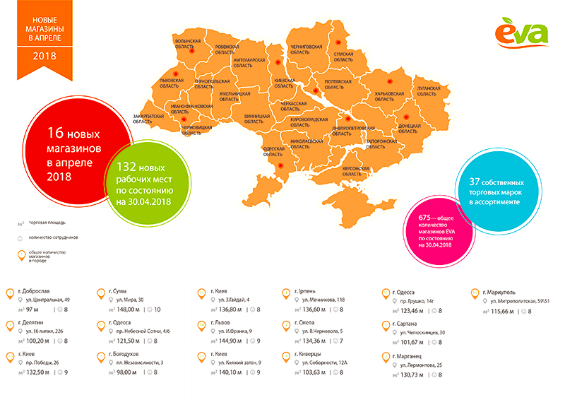 EVA насчитывает более 675 магазинов на всей территории Украины (по состоянию на 30.04.2018), в магазинах представлено более 30 тысяч ассортиментных позиций, 37 собственных торговых марок, штат сотрудников компании - более 7,7 тысяч человек.