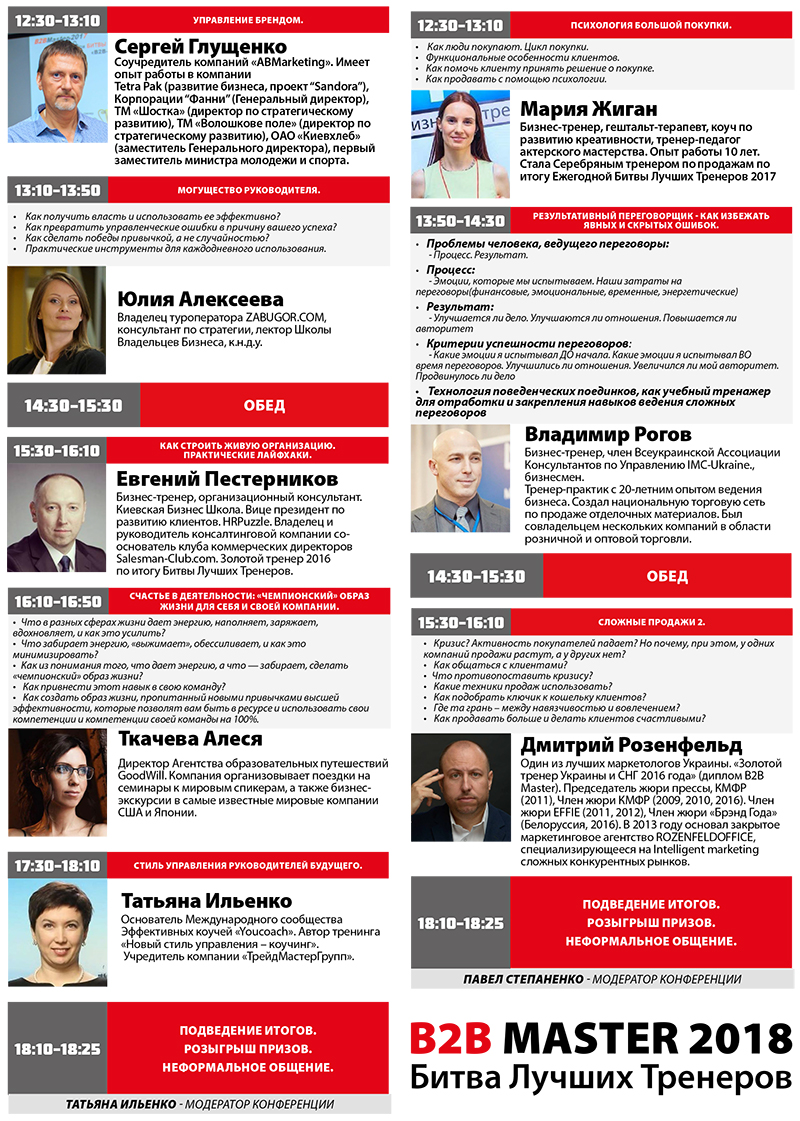 Формат конференции уникален тем, что в двух параллельных залах пройдут мастер-классы ТОП-Тренеров Украины и Зарубежья, между которыми состоится «БИТВА ТРЕНЕРОВ», оценивать и выбирать победителей будете Вы, участники конференции, и по итогам будут определены Золотой, Серебряный и Бронзовый Тренер 2018 года!