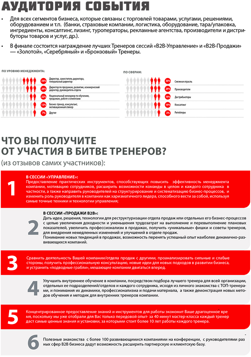 Аудитория конференции: более 150 участников из всех сегментов бизнеса, которые связаны с торговлей товарами, услугами, решениями, оборудованием и др. - именно для корпоративного клиента (В2В).