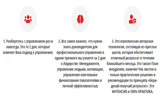 За два дня участники тренинга разберут все нюансы управленческих процессов. Лидерство, менеджмент, управление людьми, мотивации, управление ключевыми финансовыми показателями и личной эффективностью - эти и другие темы раскроют тренеры Игорь Немировский и Инна Старожукова.
