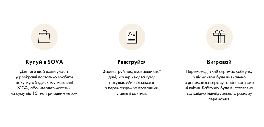 Каблучку з діамантом в один карат ювеліри SOVA виготовлять спеціально для переможця. Для того щоб взяти участь у розіграші достатньо зробити покупку в будь-якому магазині SOVA, або на сайті sovajewels.com на суму від 15 тис. грн одним чеком, зареєструватися та чекати розіграшу.