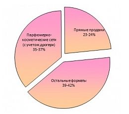 Среди ключевых каналов реализации парфюмерно-косметической продукции можно выделить следующие: прямые продажи, включая продажи по каталогам, и специализированные сетевые магазины. Суммарно они обеспечивают более 55% розничных продаж парфюмерии и косметики. В 2011-2012 гг. начала расти доля интернет-продаж, однако оценить ее сложно из-за отсутствия достаточного объема данных.