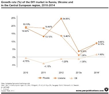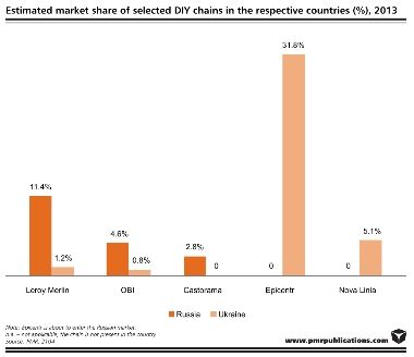 Исходя из данных нового исследования польской консалтинговой компании PMR, розничный рынок в сегменте DIY по итогу 2013 году в Украине вырос на 4,7%, а в России на 9,7%. Стоит отметить, оба рынка являются одними из самых быстрорастущих в Центральной и Северной Европе, но менее развитыми по сравнению с другими странами.