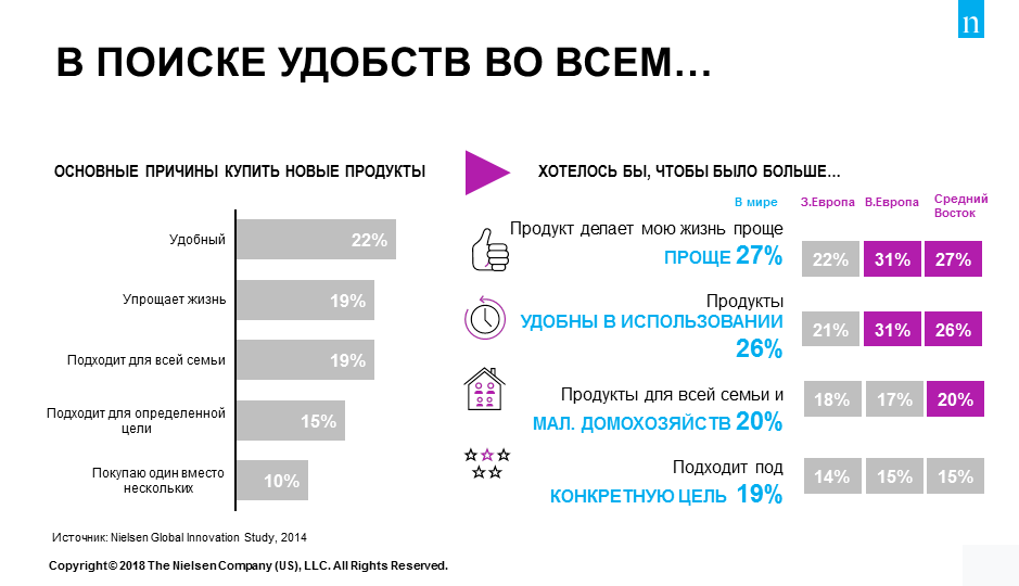 В отчете Nielsen Quest for Convenience проанализированы динамика поведения потребителей в мире за последние несколько лет, особое внимание уделяется факторам, которые стимулируют потребность в удобстве: урбанизация, увеличение времени для коммуникации, изменение распределения гендерных ролей в обществе. В мире под понятием «удобство» люди понимают простоту, экономию времени и пригодность. Отчет включает в себя глобальную перспективу на тренды, анализ потребителей в разных регионах и странах и сопоставление и сравнение тенденций, указывающих на удобство, в мире и в отдельно взятых странах.