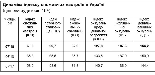 У липні 2018 року індекс споживчих настроїв (ІСН) склав 61,8, що на 3,8 п. менше, ніж минулого місяця.