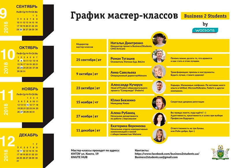 9 октября - Анна Савельева, операционный директор компании «Watsons» Украина расскажет о важности работы с людьми. Её мастер-класс называется «Трансформация: приемы и инструменты. Будьте лучше, станьте дороже!» Также, Анна добавила: «Мне эта тема близка, это продолжение моей первой встречи с ребятами. В Watsons ничего не поменялось: наш принцип - работа не в компании, а работа с людьми, коммуникация. Ожидания людей должны совпадать с тем, что они готовы дать на месте работы, как они готовы развиваться, что бы они не разочаровались, что бы смогли реализовать себя, найти себя, сформировать новые привычки, которые им помогут в реальной жизни. Меняться, учиться, быть открытым ко всему новому, любить людей, налаживать отношения с клиентами и сотрудникам. Все теоретические знания должны быть «вкусненько приправлены» человекоцентрискими качествами, компетенциями. Я расскажу о самых ценностных компетенциях, что бы студенты смогли заглянуть в себя и оценить свои силы».