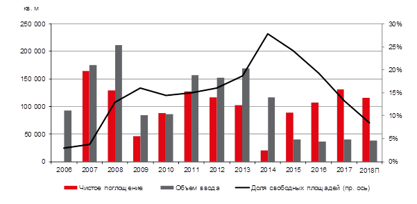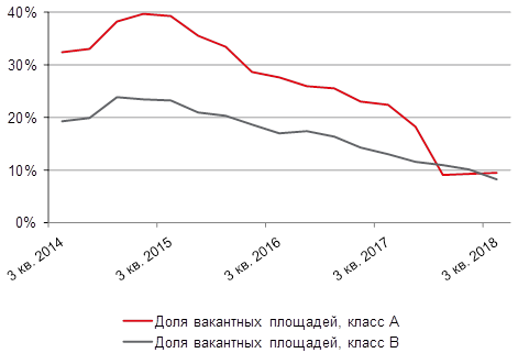 По итогам сентября 2018 года вакантность в наиболее качественных объектах составила 9,6%, увеличившись за квартал на 0,3 п.п., свидетельствуют данные компании JLL. В классе B снижение вакантности продолжается: по итогам последних трех месяцев она уменьшилась на 1,8 п.п., до 8,3%.