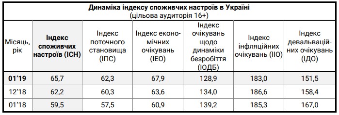 У січні 2019 року індекс споживчих настроїв (ІСН) склав 65,7, що на 3,4 п. більше за показник грудня 2018.