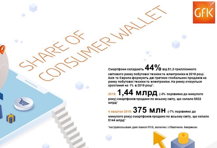На світовому ринку побутової техніки та електроніки, що складає 1,2 трильйони доларів, провідним сегментом залишається ринок смартфонів, мобільних телефонів та натільних пристроїв із часткою 44%. Хоча світовий попит на смартфони у 2018 році знизився на 3% (до 1,44 млрд товарних одиниць), однак загалом продажі залишаються на високому рівні і досягли 522 млрд доларів. Це результати дослідження, підготованого GfK до відкриття Mobile World Congress 2019 у Барселоні.