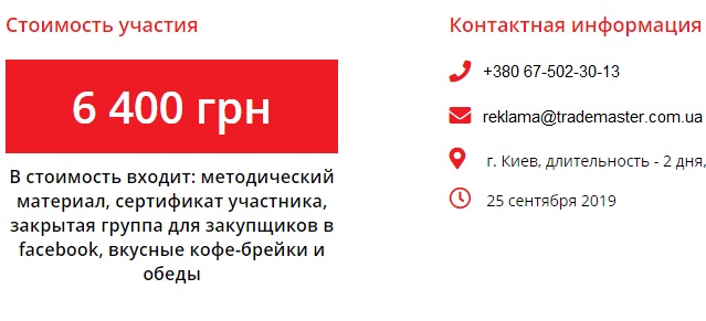 Вы можете задать уточняющие вопросы, получить любую дополнительную информацию о Тренере и Программе тренинга, звоните по тел.: (067) 502-30-13, или пишите на электронную почту: reklama@trademaster.com.ua
