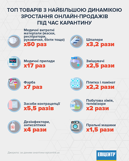 Що стосується «карантинної» географії, лідерами за кількістю замовлень в epicentrk.ua стали міста-мільйонники: Київ, Одеса, Львів, Харків, Дніпро. Також до першої десятки міст з найбільшою реалізацією в онлайн-торгівлі у березні потрапили Чернівці, Чернігів, Кривий Ріг, Бровари та Миколаїв, кількість онлайн-замовлень у кожному із цих міст виросла у 3-5 рази.